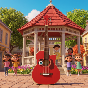 En un pueblito escondido entre colinas doradas y campos floridos, había una plaza que parecía salida de un sueño. En el centro, un antiguo quiosco con techo rojo guardaba historias de muchas músicas y risas.